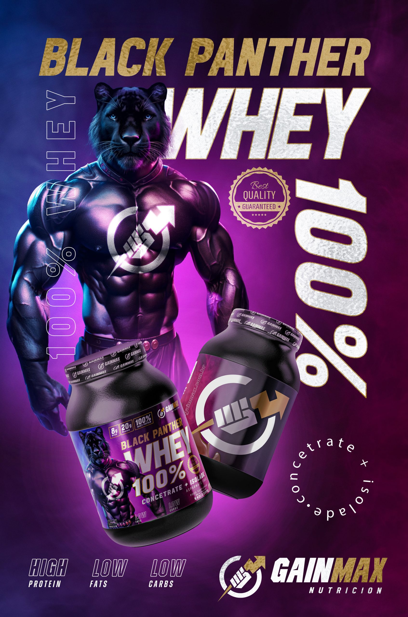 With the new packaging, “Black Panther Whey 100%” stands out on store shelves, conveying its purpose clearly and effectively. Additionally, the packaging reinforces the identity of the Gainmax Nutricion laboratory, strengthening the brand’s presence in the nutritional supplement market.